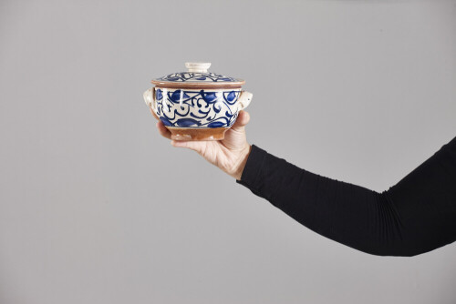 امرأة ترتدي عباءة سوداء تحمل أدوات فخارية مختلفة في أوضاع متعددة