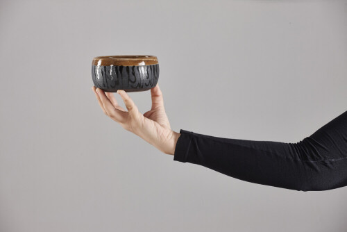 امرأة ترتدي عباءة سوداء تحمل أدوات فخارية مختلفة في أوضاع متعددة