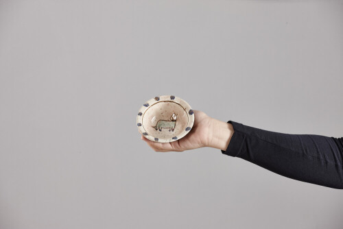 امرأة ترتدي عباءة سوداء تحمل أدوات فخارية مختلفة في أوضاع متعددة