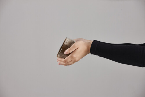 امرأة ترتدي عباءة سوداء تحمل أدوات فخارية مختلفة في أوضاع متعددة