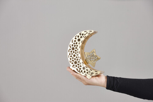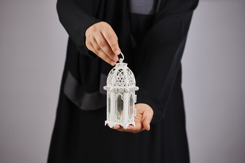 امرأة ترتدي عباءة سوداء تحمل فوانيس رمضانية مختلفة في أوضاع متعددة