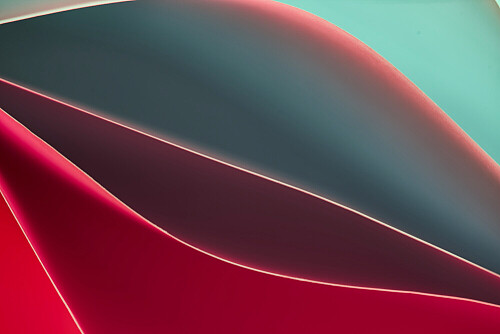 هذه الصورة تعرض تكوين فن الورق التجريدي مع منحنيات ورقية بتدرجات اللون الأخضر والأحمر المكونه بواسطة الضوء الملون