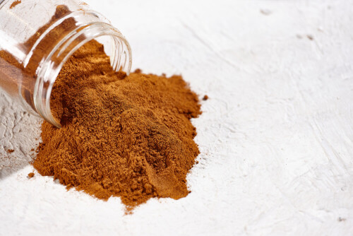وعاء زجاجي ممتلئ ببودرة البابريكا مقلوب مع بعض البودرة المتناثره منه على خلفية بيضاء