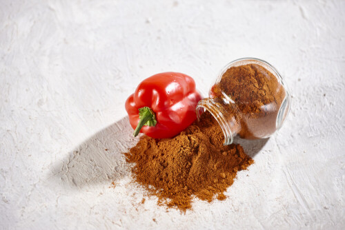 وعاء زجاجي ممتلئ ببودرة البابريكا مقلوب مع بعض البودرة المتناثره منه على خلفية بيضاء