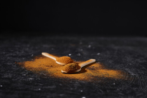ملعقتان خشبيتان كلاهما ممتلئ ببودرة البابريكا علي خلفية سوداء