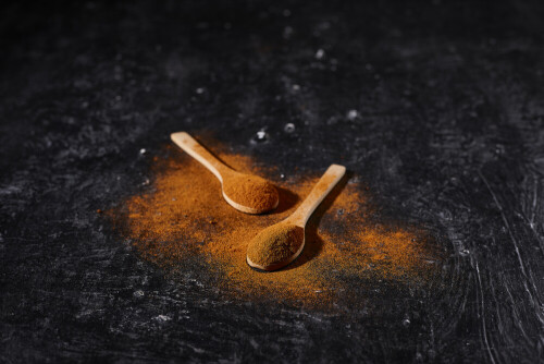 ملعقتان خشبيتان كلاهما ممتلئ ببودرة البابريكا علي خلفية سوداء