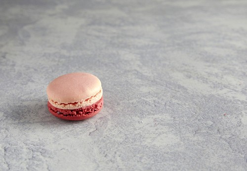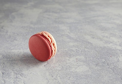 45º Shot of Pink Litchi Raspberry macaron on white  marble background