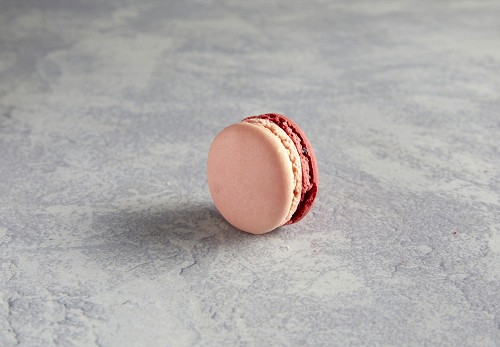 45º Shot of Pink Litchi Raspberry macaron on white marble background