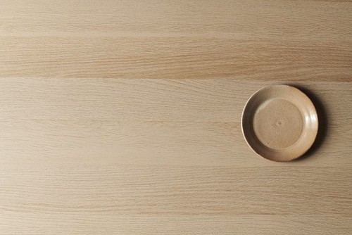 طبق من الفخار باللون البيج على خلفية خشبية فاتحة