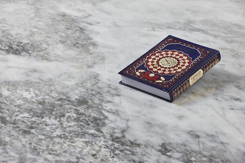 مصحف مع سبحة صلاه علي خلفية من الرخام باللون الرمادي