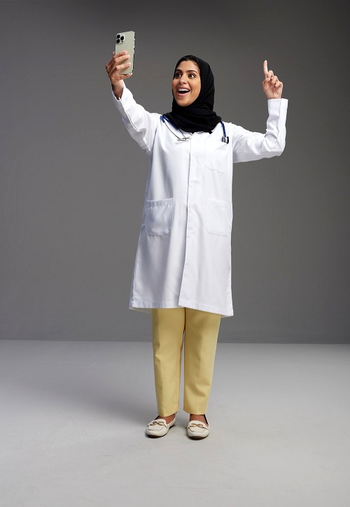 Saudi woman wearing lab coat with stethoscope standing taking selfie on Gray background