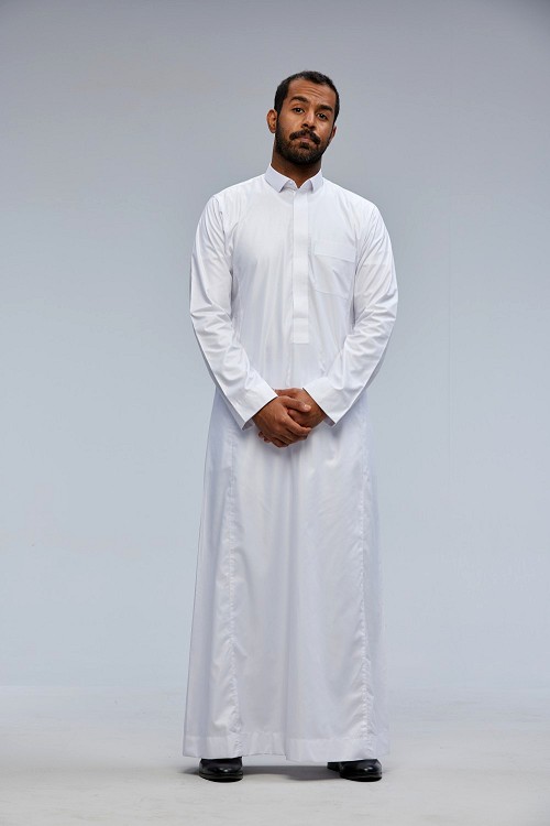 Saudi man Wearing Thob standing interacting with the camera on Gray background