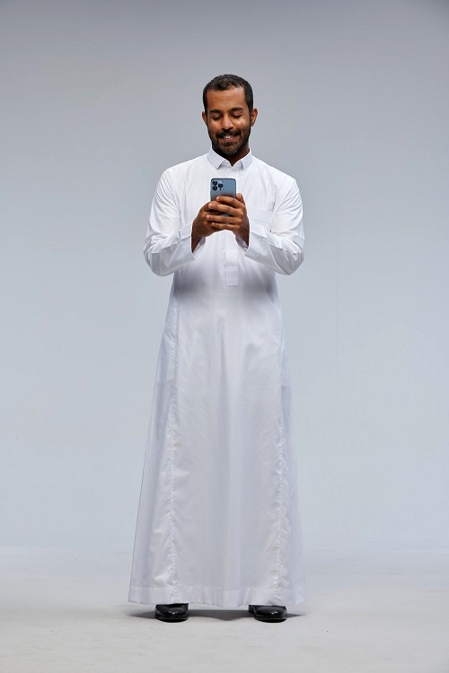 Saudi man wearing Thob standing texting on phone on Gray background