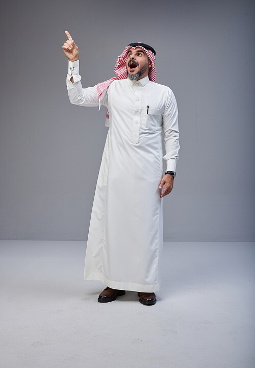 Saudi man Wearing Thob and red white Shomag standing interacting with the camera on Gray background
