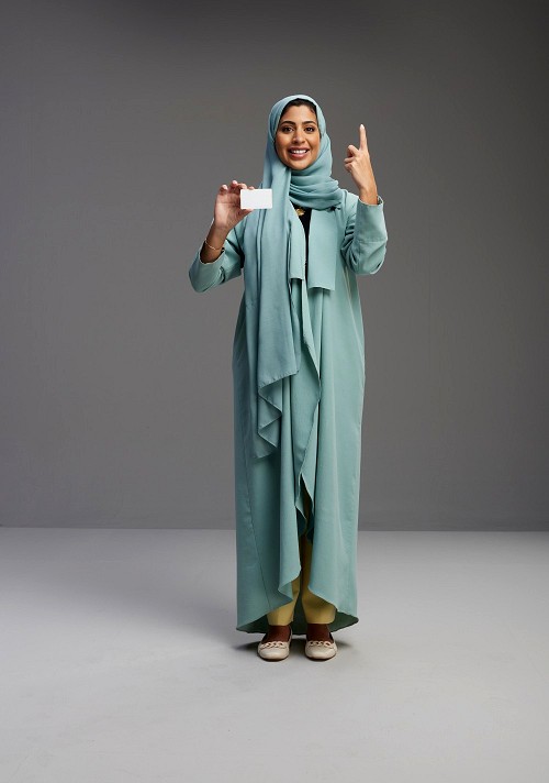 Saudi Woman wearing Abaya standing holding ATM card on Gray background