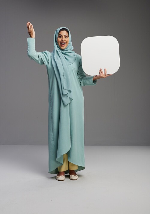 Saudi Woman wearing Abaya standing holding social media sign on Gray background
