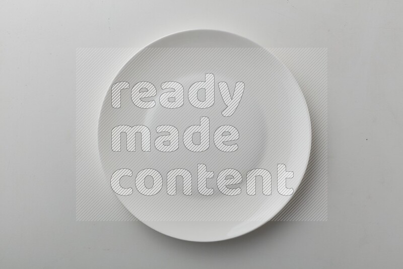 Top-view shot of a circular white plate on white background