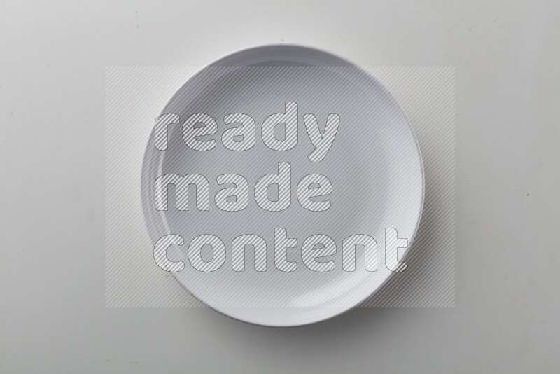Top-view shot of a circular white plate on white background