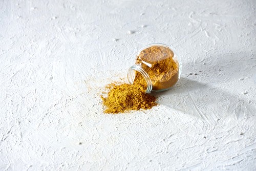 وعاء زجاجي للتوابل مقلوب ممتلئ ببودرة الكركم والبودرة سقطت خارجه على خلفية بيضاء