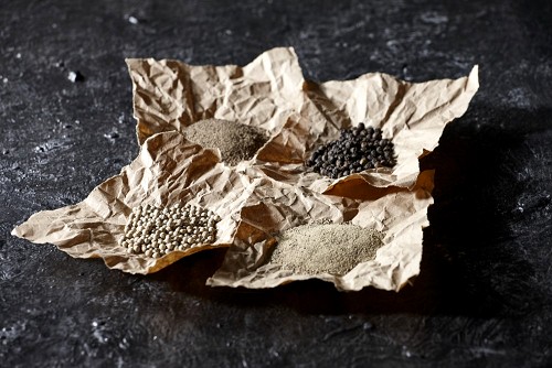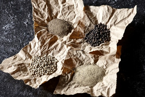قطع من الورق ممتلئة بحبوب وبودرة الفلفل الأسود والأبيض على أرضية سوداء