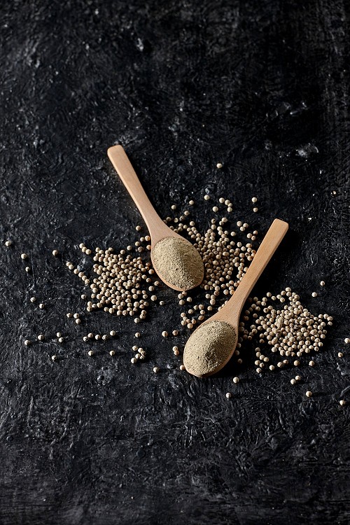 ملعقتان خشبيتان ممتلئتان ببودرة الفلفل الأبيض مع حبوب الفلفل الأبيض على أرضية سوداء