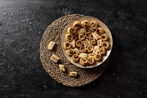 حلويات شرقية في أطباق فخارية مع المكسرات