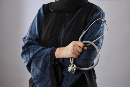 A Saudi woman Showing Her Phone Screen sitting in blue chair