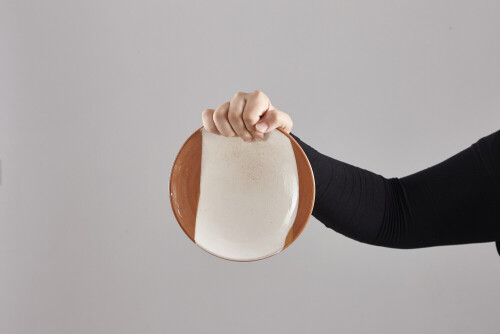 A Black Pottery Oven Plate On Grey Marble Flooring