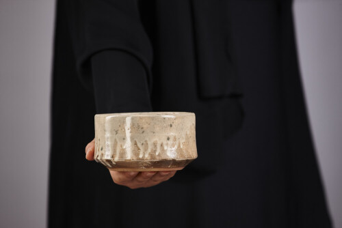multi-colored pottery Plate placed on a rectangular wooden tray