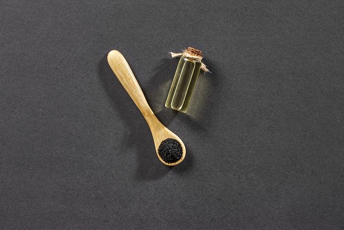 A wooden spoon full of black seeds and seeds spread beside it on a black flooring