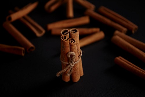 4 Cinnamon sticks stacked and bounded with more sticks in the background on black flooring
