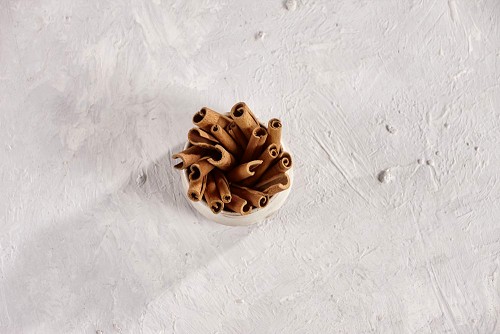 Cinnamon sticks in a beige bowl and more sticks beside it on white background