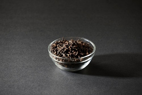 A glass bowl full of cloves on a black flooring