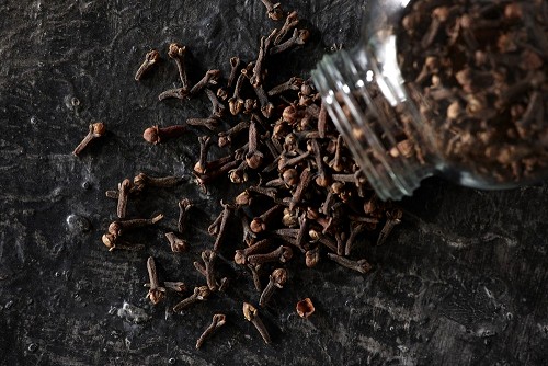 A flipped glass spice jar full of cloves and cloves came out of it on textured black flooring