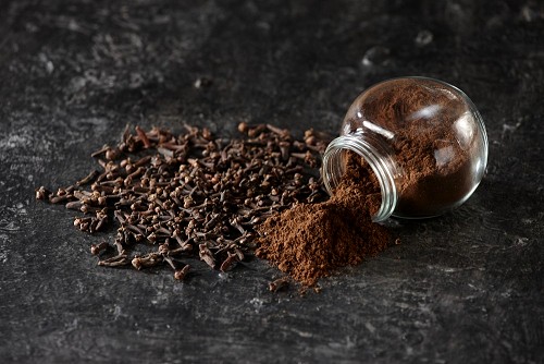 A flipped glass spice jar full of cloves powder and powder came out of it with cloves spread on textured black flooring