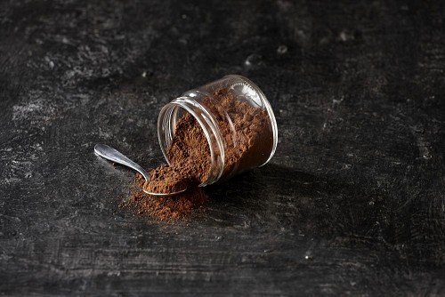 A flipped glass jar and metal spoon full of cloves powder with cloves spread on a textured black flooring