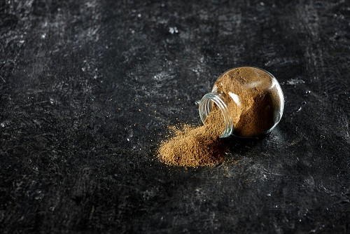 A flipped glass spice jar full of cumin powder and powder spilled out on a textured black flooring
