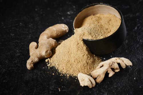 A black pottery bowl full of ground ginger powder with fallen powder from it on black background