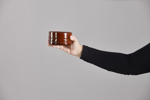 A woman in black abaya holding different pottery essentials in different positions