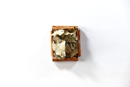 A single square of cinnamon sticks full of laurel bay on white flooring