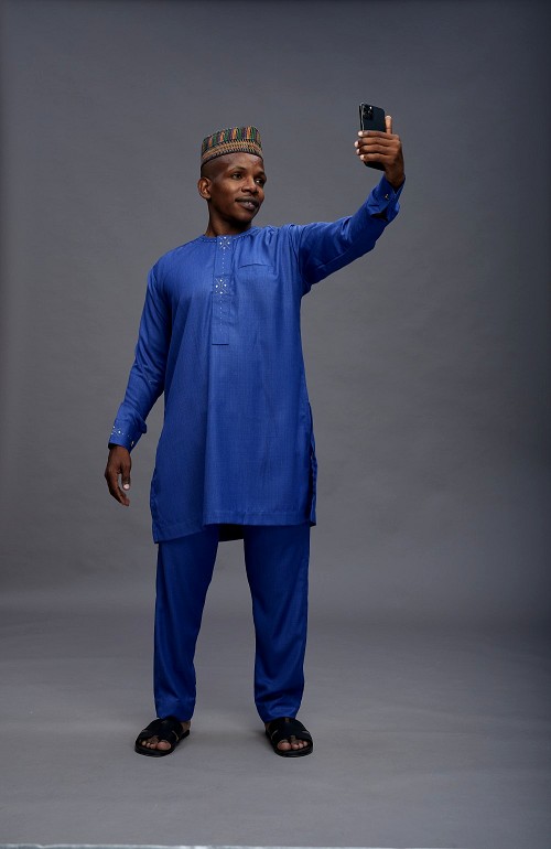 Man wearing Nigerian outfit standing taking selfie on gray background