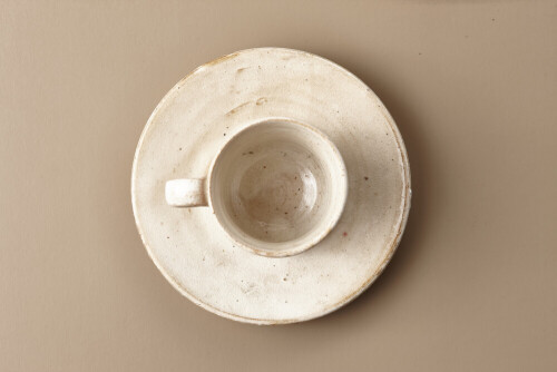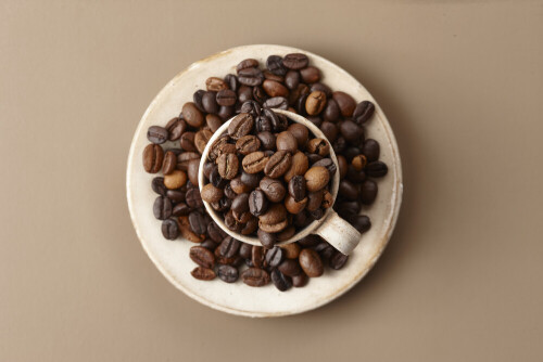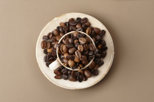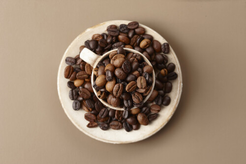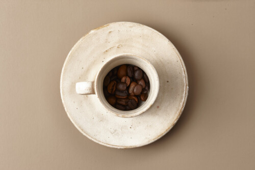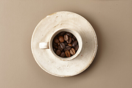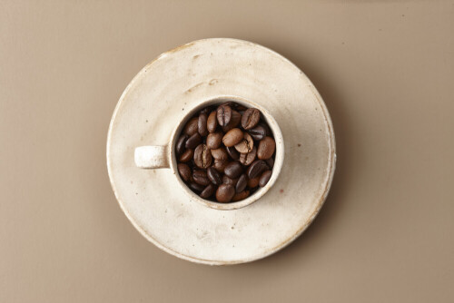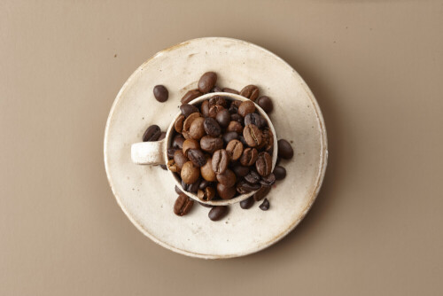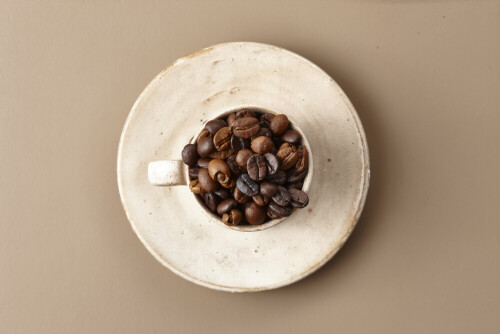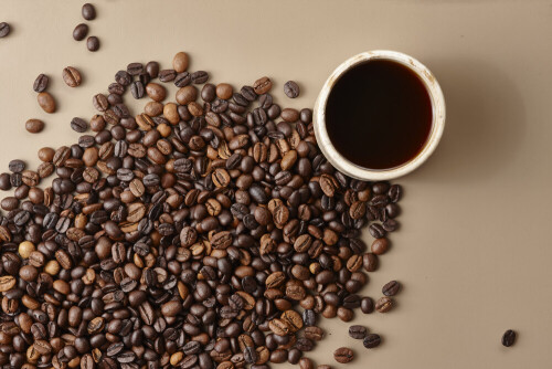 A beige pottery cup of coffee surrounded by roasted coffee beans on beige background