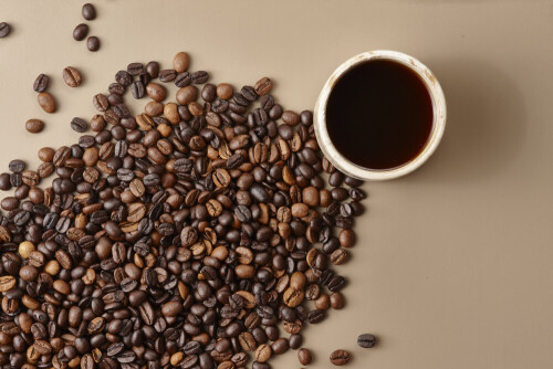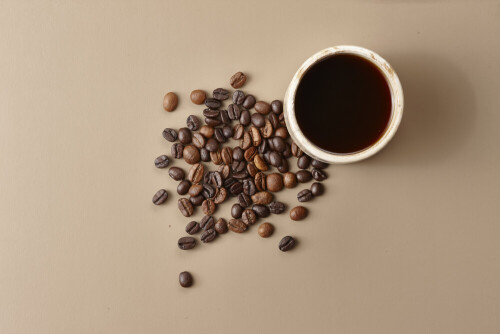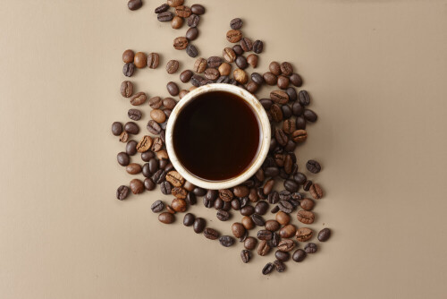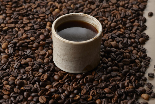 A beige pottery cup of coffee surrounded by roasted coffee beans on beige background