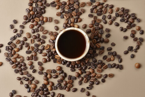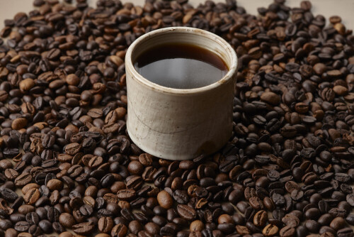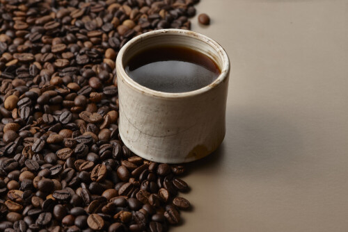 A beige pottery cup of coffee surrounded by roasted coffee beans on beige background