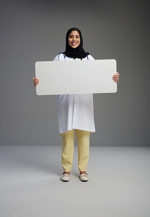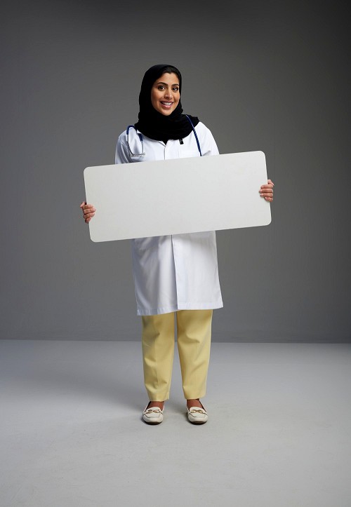 Saudi woman wearing lab coat with stethoscope standing holding board on Gray background