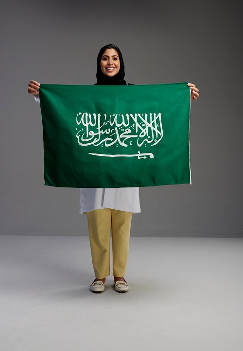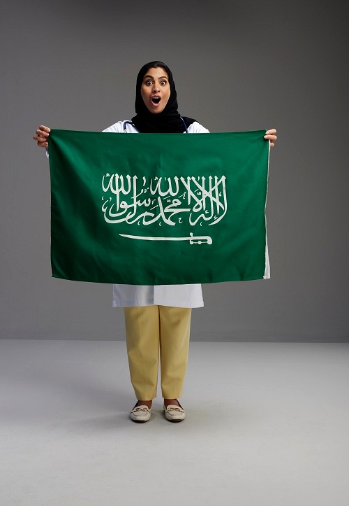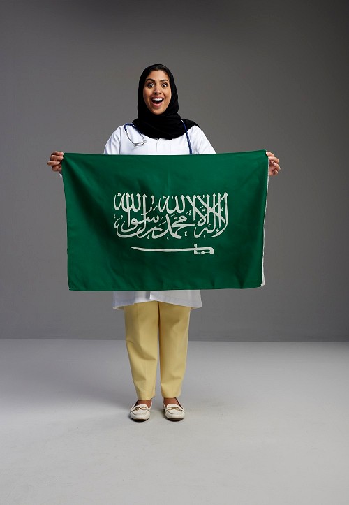 Saudi woman wearing lab coat with stethoscope standing holding Saudi flag on Gray background