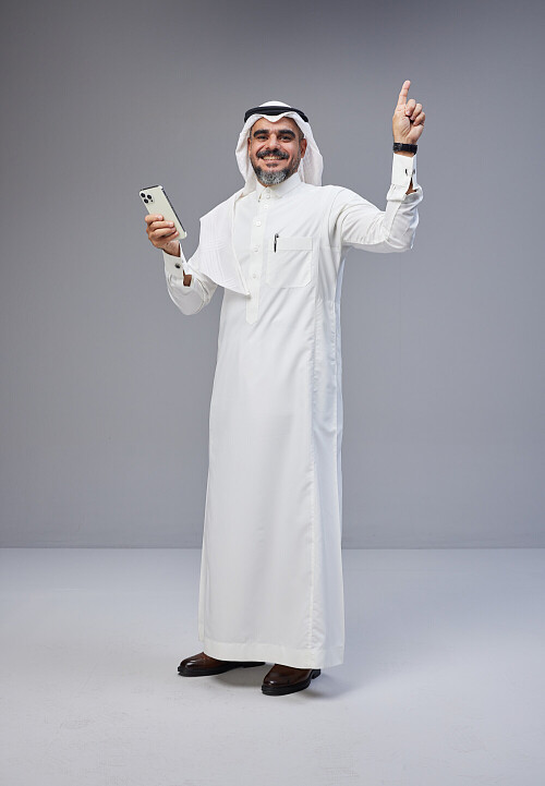 Saudi man Wearing Thob and white Shomag standing texting on phone on Gray background