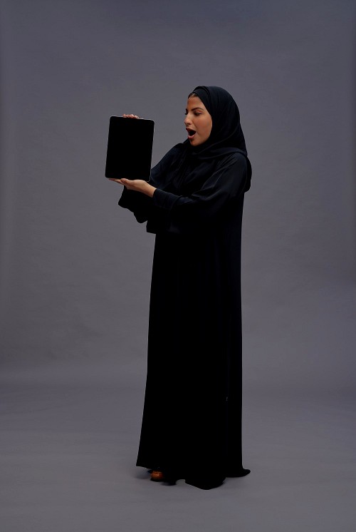 Saudi woman wearing Abaya standing showing tablet to camera on gray background