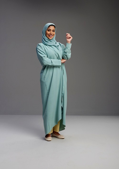 Saudi Woman wearing Abaya standing interacting with the camera on Gray background