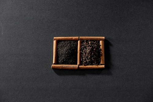 2 squares of cinnamon sticks full of tea and cloves on black flooring